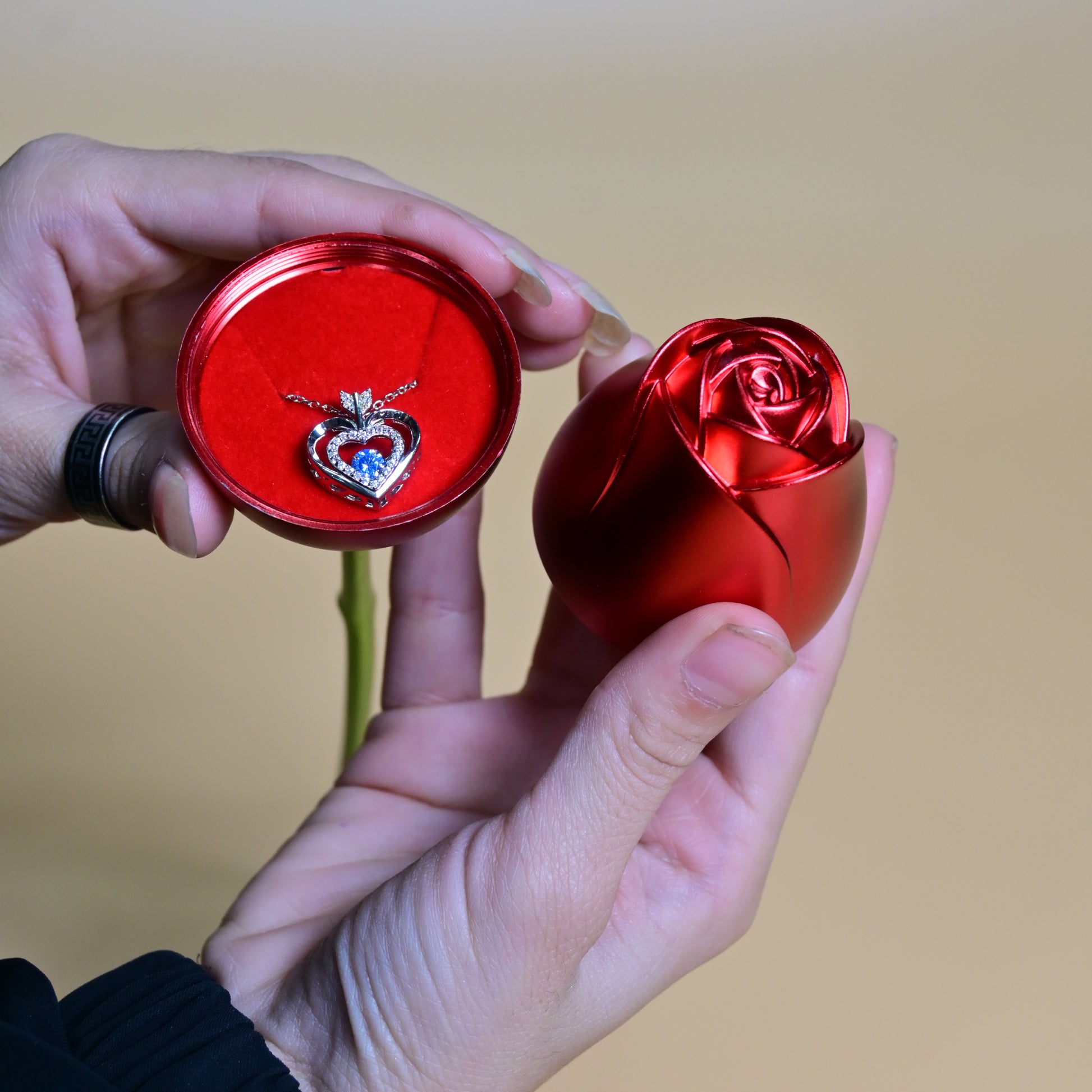A hidden jewellery drawer reveals a stunning surprise—perfect for presenting rings, necklaces, earrings, or any special gift meant to be cherished.